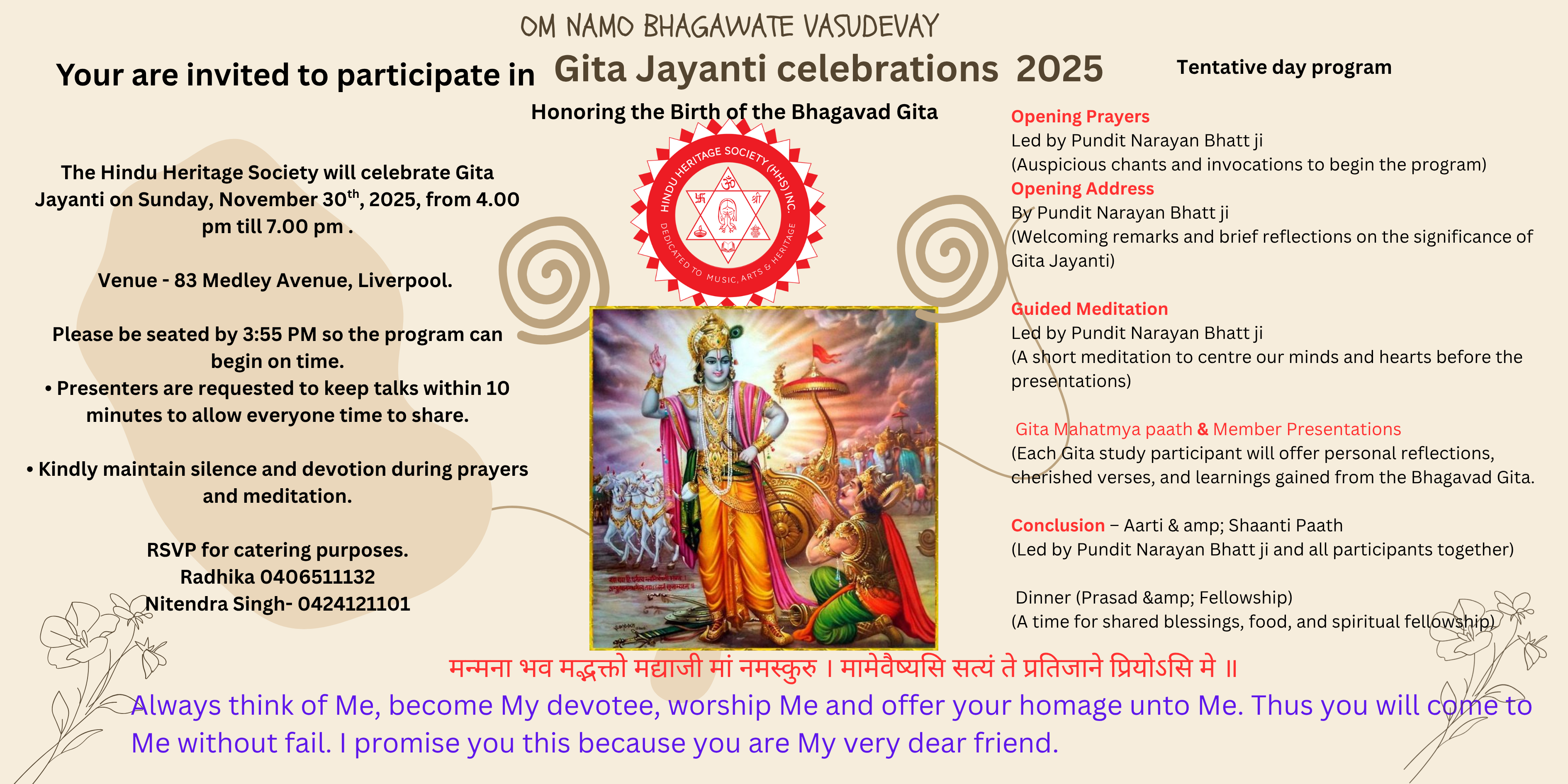 The Hindu Heritage Society (HHS) will celebrate this sacred occasion on Sunday, 30th November 2025, from 4:00 PM to 7:00 PM.